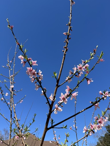 - My new little peach tree has a million blossoms. I hope to be offering peach jam around May or June.
