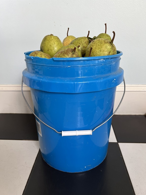 We began harvesting figs from our fig tree at the end of June. For two weeks we harvested twice per day until the tree finally decided to call it quits. Even though we competed with the squirrels and the birds, we harvested 68 pounds of figs. My plan was to make up a little and freeze the rest for later because I knew that the pears were about to ripen as well. Once the pears were on I would need to make jam out of those and come back to the figs when the pear trees were done. It was a good plan, until the freezer was so full of figs that there was no room for anything else and Shellie wanted her freezer back. So I began alternating batches of figs with batches of pears. As of this writing, the figs in the freezer are down to a manageable level, so I am now concentrating on pears. But for a while, I was making 2 and even 3 batches of jam per day, alternating between the two.
