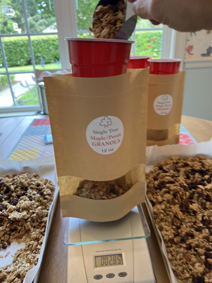 Using their kitchen, I have had to alter my processes a bit. I started out by hauling all my ingredients next store for each batch and then hauling them all back home afterwards. Then I figured out that it was much easier if I mix all the dry ingredients at my house, take them over, and add the wet ingredients there. That worked out a lot better. And I had to get used to a different oven. My first batch in the neighbor’s oven turned out to be a little toastier than I expected, so I have had to alter the baking times. But we got that squared away and I am now able to produce fresh, delicious Single Tree granola as needed.
