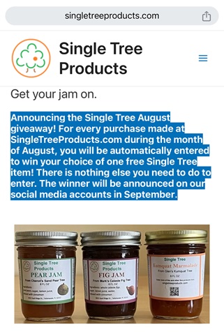 - In case you haven’t heard, the great Single Tree August Giveaway is underway! For every purchase made at our website, you are automatically entered to win one free product of your choice. Don’t miss out! {;ace your order today. The winner will be announced in September.