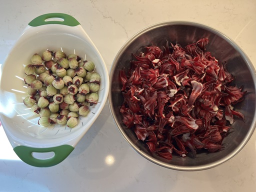 My next challenge was to harvest enough rosellas to make a full batch. By my estimation from the trial, it would require 84 rosellas to make one batch of 6 jars. I ended up harvesting 88 and that was probably only half of what was on Susan’s plant. I discovered that a rosella is a great place for a variety of little bugs to hide, so thoroughly washing them was important. I carefully washed them and removed the hard, red parts (called the calyxes) from the seed pods. then washed everything again.