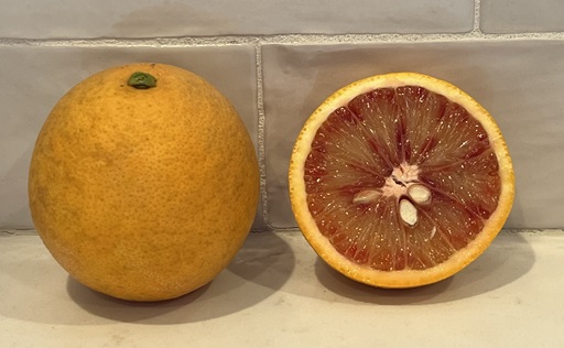 My friend Samantha provided me with some blood oranges from her tree. The dark color in the flesh of blood oranges is due to the presence of anthocyanins, a family of pigments common to many flowers and fruit, but uncommon in citrus fruits. The flavor is definitely that of an orange, but almost with a hint of raspberry mixed in.